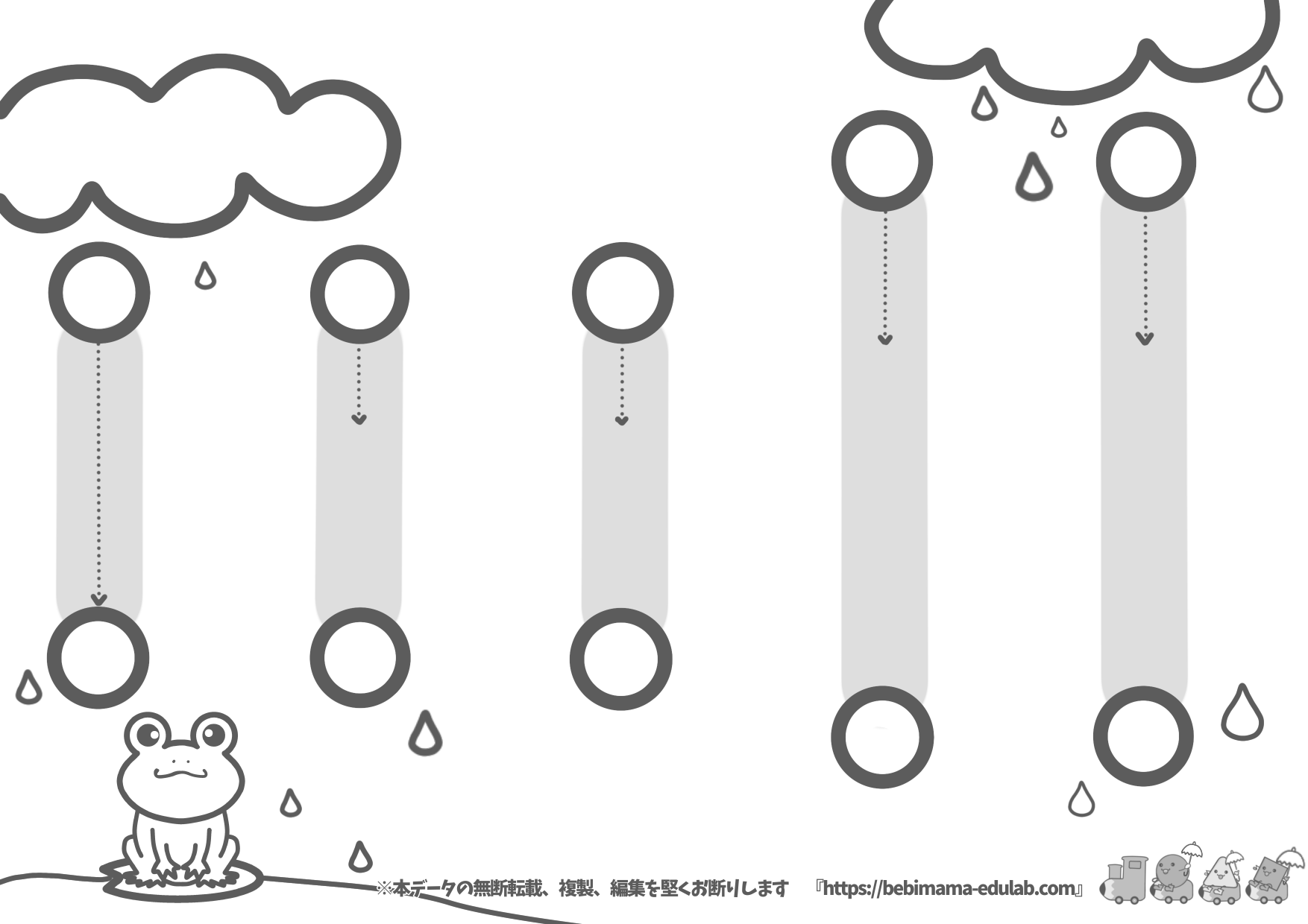 100円ショップなどで売られている丸いシールを貼って、雨を作ろう!雨と雨を線でつないで、直線をかく練習にもなるよ!